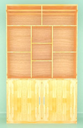 Vật liệu: Gỗ cao su/gỗ thông ghép thanh cao cấp loại 1 (AA) dày 15mm, đã qua xử lý chống ẩm mốc, mối mọt, không cong vênh, sơn phủ bóng cao cấp (hậu alu màu vân gỗ dày 3mm), mica 5mm. Tủ gồm 02 phần: phần trên không cánh, tầng trên cùng chia 02 khoang với 02 thanh suốt gỗ; phía dưới chia 03 khoang, 2 khoang 2 bên chia 2 tầng, khoang giữa chia 3 tầng; Phần dưới là ô tủ 02 cánh gỗ mở, có tay nắm kim loại, chân có bánh xe di chuyển.